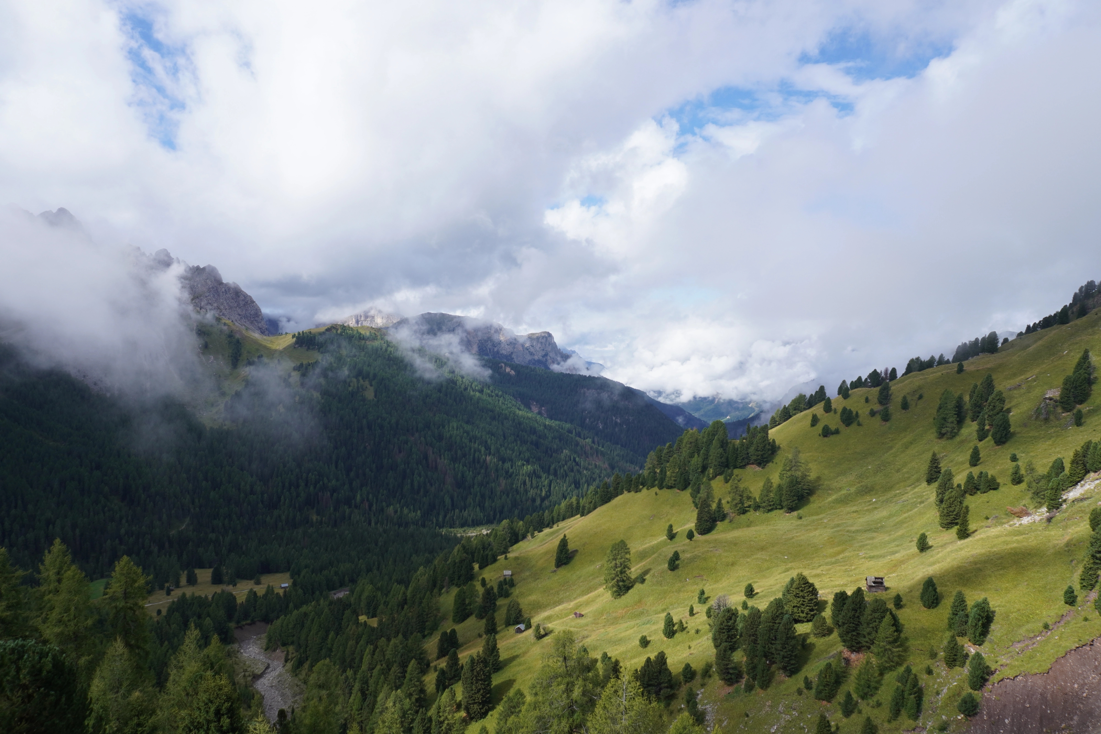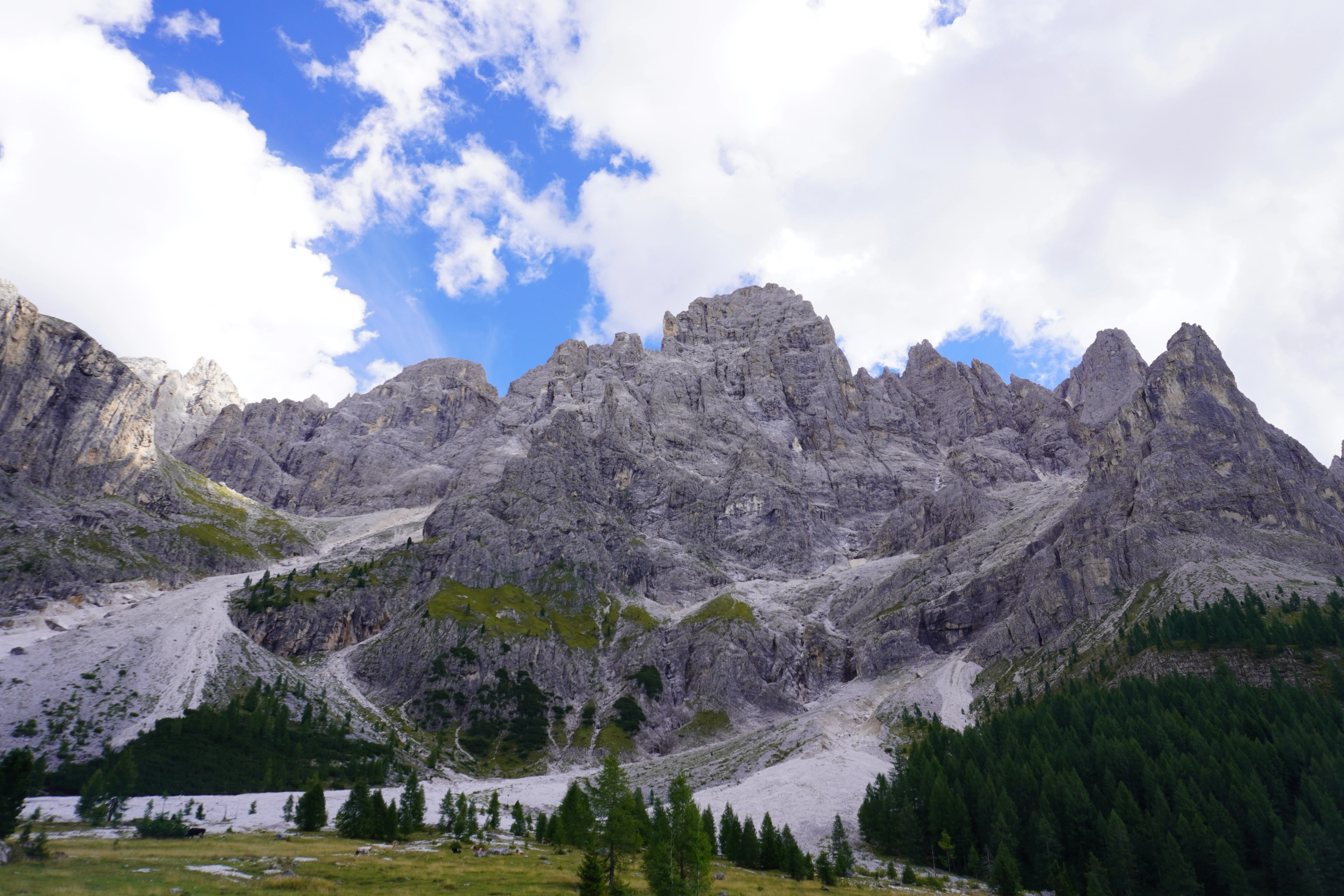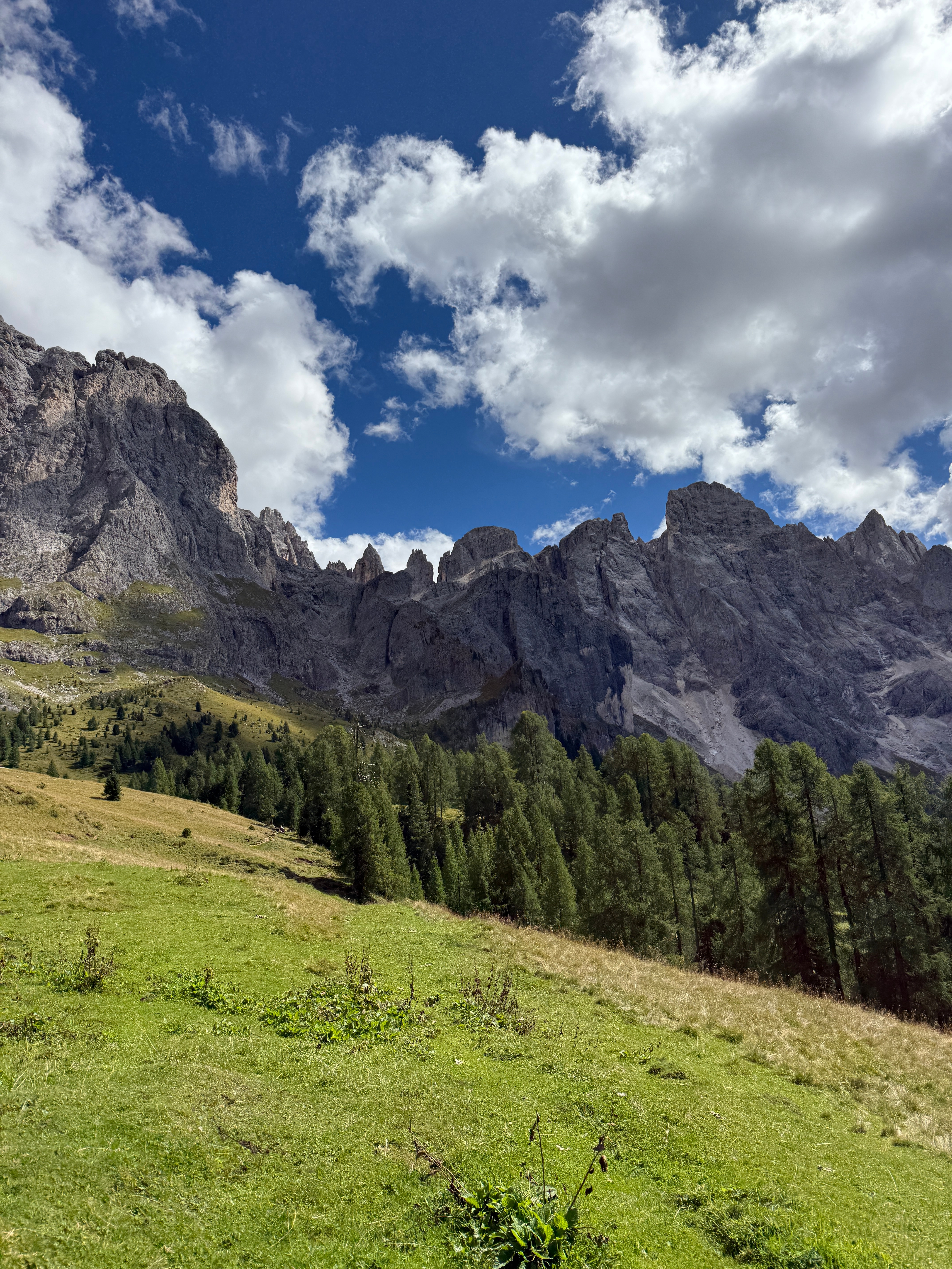 The section of the hike was absolutely epic and a bit freaky. We summitted at Pas da le Cirele then had to hike down the front of the peak at a 33 degree grade (imagine a little less than vertical) on a loose rock field. It was horrifying! While we were hobbling along fearing for our lives, we were surrounded by 70+ year old germans running down the cliff face like it was nothing. It was my nightmare climb, but we did it and I felt very proud of myself. After the scree descent we came down into a heavenly valley covered in bright green grass, dotted with purple crocuses, and filled with the gentle sound of cowbells. We ate a gorgeous lunch at Refugio Fuchiade then hiked down into Passo San Pellegrino where we stayed the night.